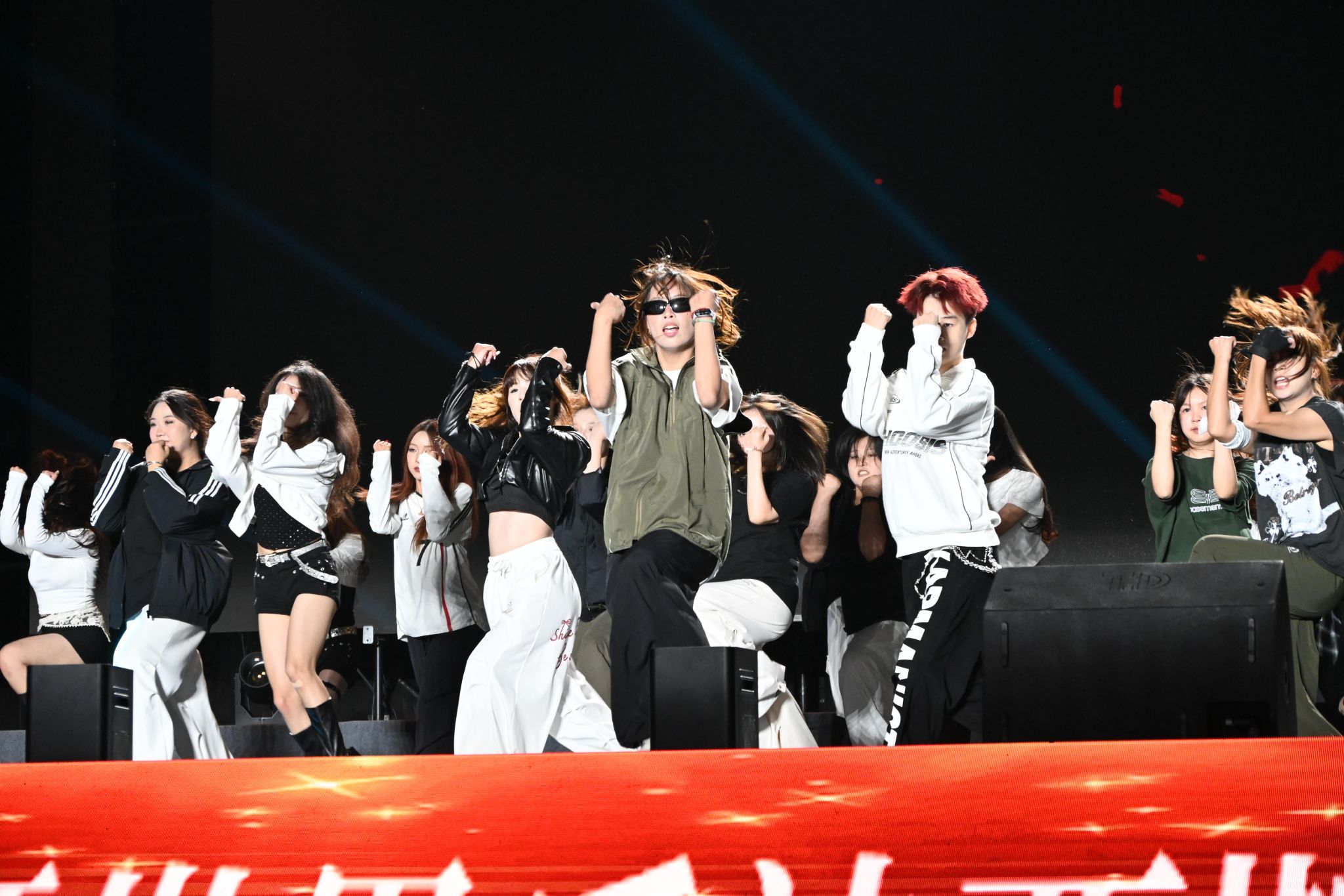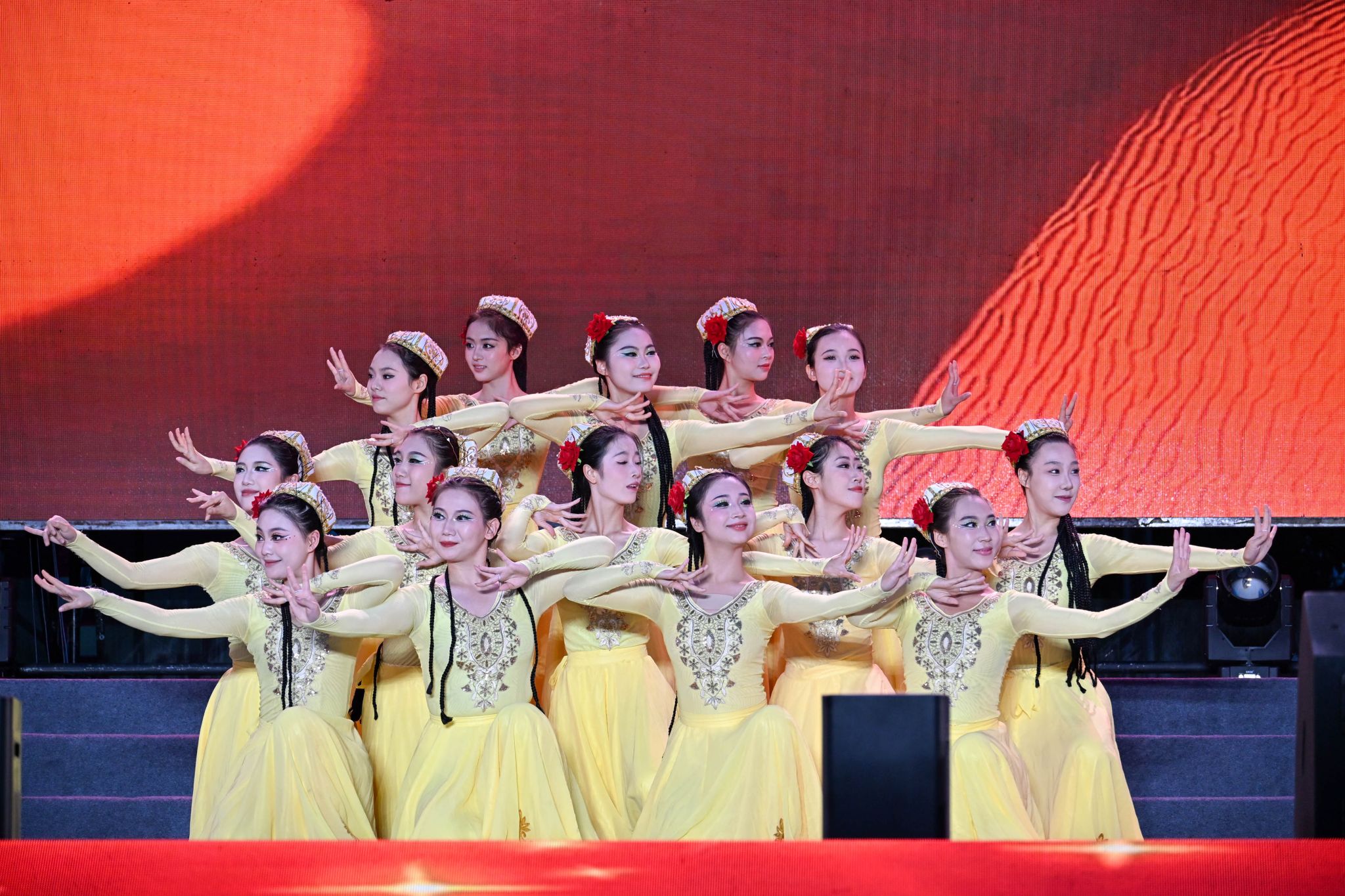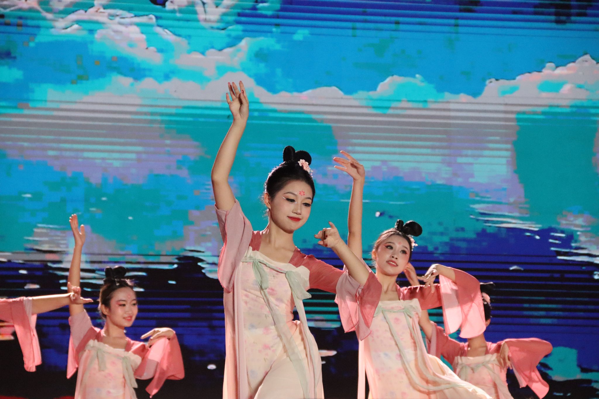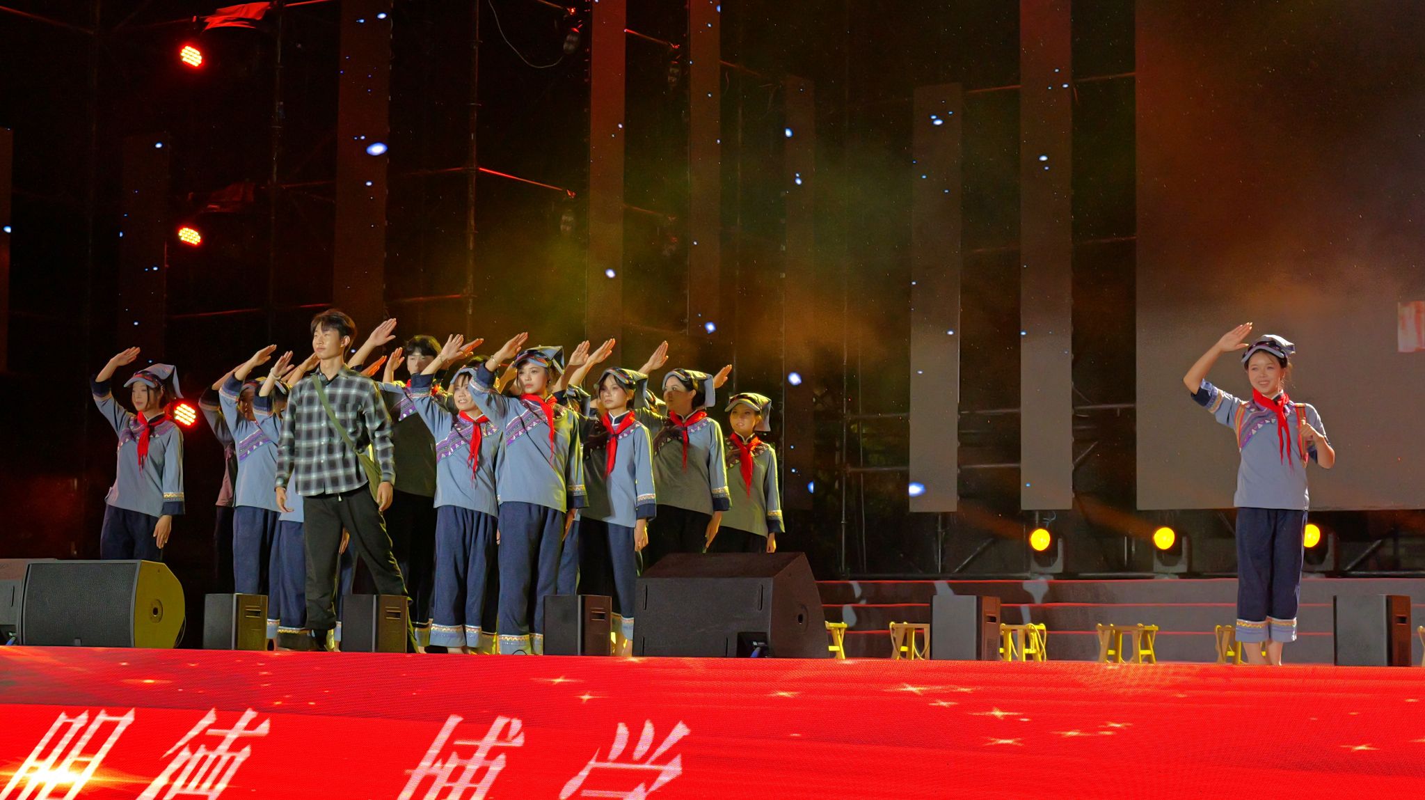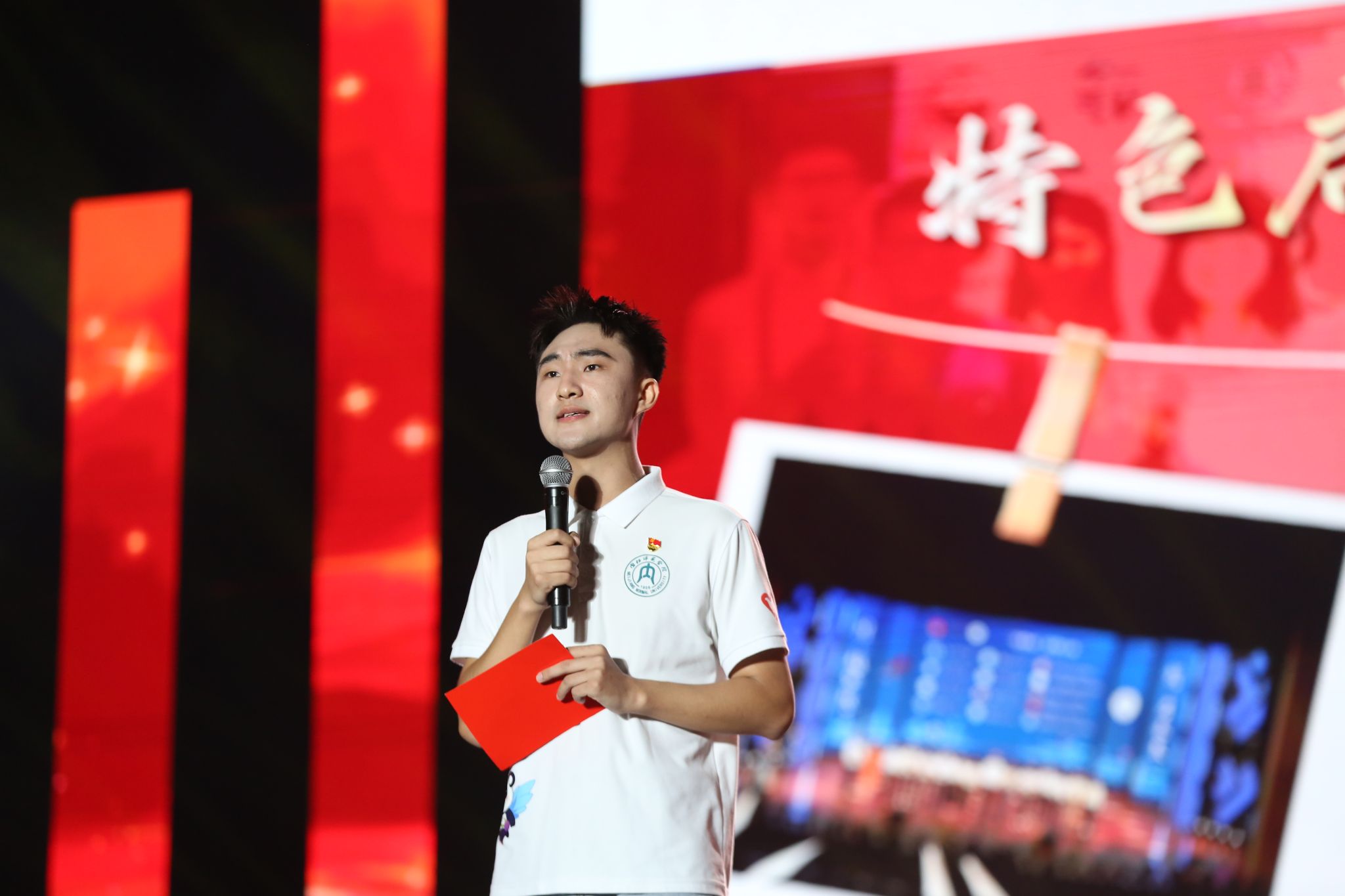 第一篇章“潮起桐梓”在开场舞《大漠沙海》中拉开序幕,舞姿刚柔并济,意境悠远;紧随其后的舞蹈《LIKE JENNIE》和管弦乐《青春VIVA》洋溢青春朝气,点燃全场热情;《唱支山歌给党听》《月下逢》《汉韵风华》等节目融合传统韵味与现代表达,展现文化传承与创新活力;“沱江学子说”则以铿锵誓言诉说内师青年的理想与抱负。第二篇章中,配音秀《你好,新“声”活!》、街舞《有的是力气》等节目活力四射,歌曲《那些我尚未知道的美丽》传递积极向上的信念,舞蹈《一个都不能少》讲述支教故事,《青马学员说》则号召青年在实践中淬炼成长。第三篇章《山河》献礼抗战胜利80周年,《鎏金年代》模特秀尽展青春风采,《叶脉成画》《峨眉武魂》彰显非遗文化与武术魅力,尾声《我们的新时代》唱响奋进之志,凝聚青春力量。