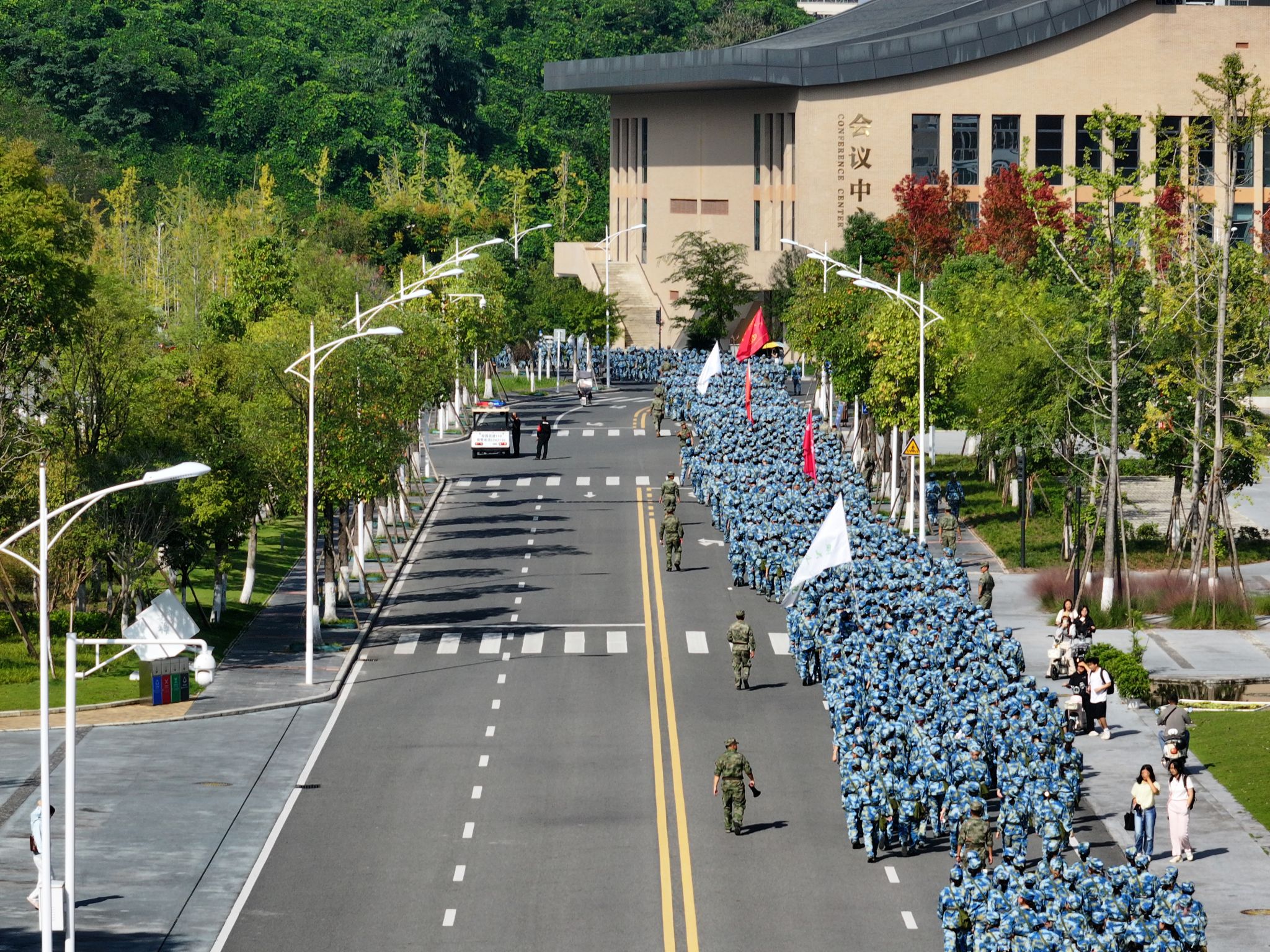 9月25日上午,学校组织2025级新生开展军训拉练和空袭演练。本次活动以田径场为起点,途经培伦苑、医务中心、学术交流中心、行知楼、培新中心、会议中心、苌弘剧院等处,全程5公里。