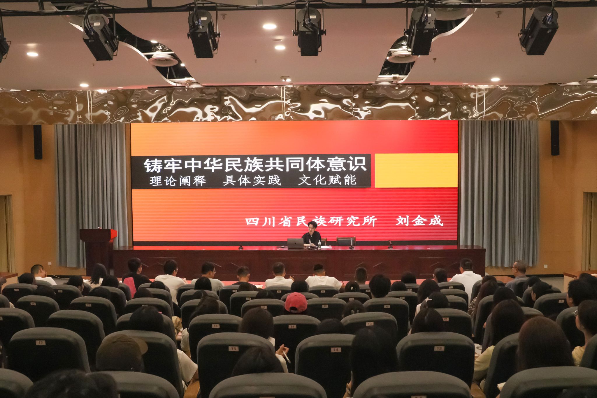 为深入贯彻落实党的民族政策,进一步铸牢中华民族共同体意识,深化民族团结进步教育,10月10日下午,学校在会议中心大报告厅举办铸牢中华民族共同体意识专题讲座,四川省民族研究所副研究员、哲学博士刘金成受邀主讲。讲座由学校党委常委、宣传部部长、统战部部长陈湘主持。