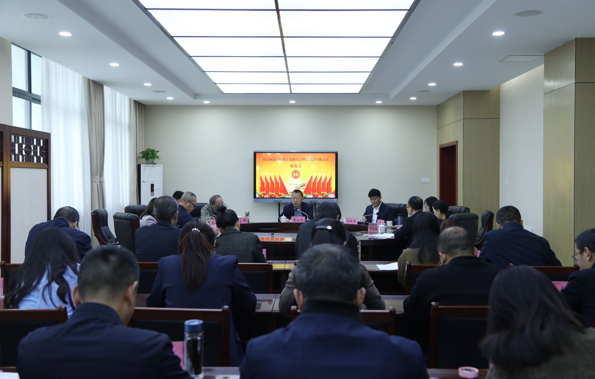 10月27日,内江师范学院第五届教代会暨工代会专题会议在会议中心大报告厅顺利召开。校党委书记黄永忠,党委副书记、校长郭云东等全体校领导出席会议,教代会、工代会正式代表、列席人员共计161人参加会议。会议由校党委副书记、工会主席黄辉主持。